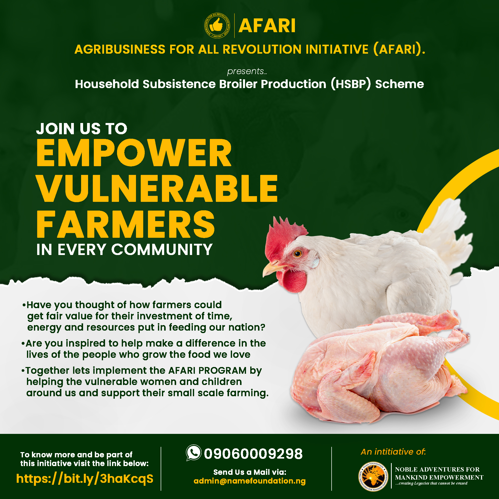 Are you interested in empowering vulnerable women. You can work with NAME Foundation to empower them through the AFARI program. You will nominate vulnerable women for the scheme and you could either fund their farms or guarantee the delivery of their matured chicken if they are founded by AFARI Investors. When you guarantee and fund, your investment will attract returns of about 1-2% per month.